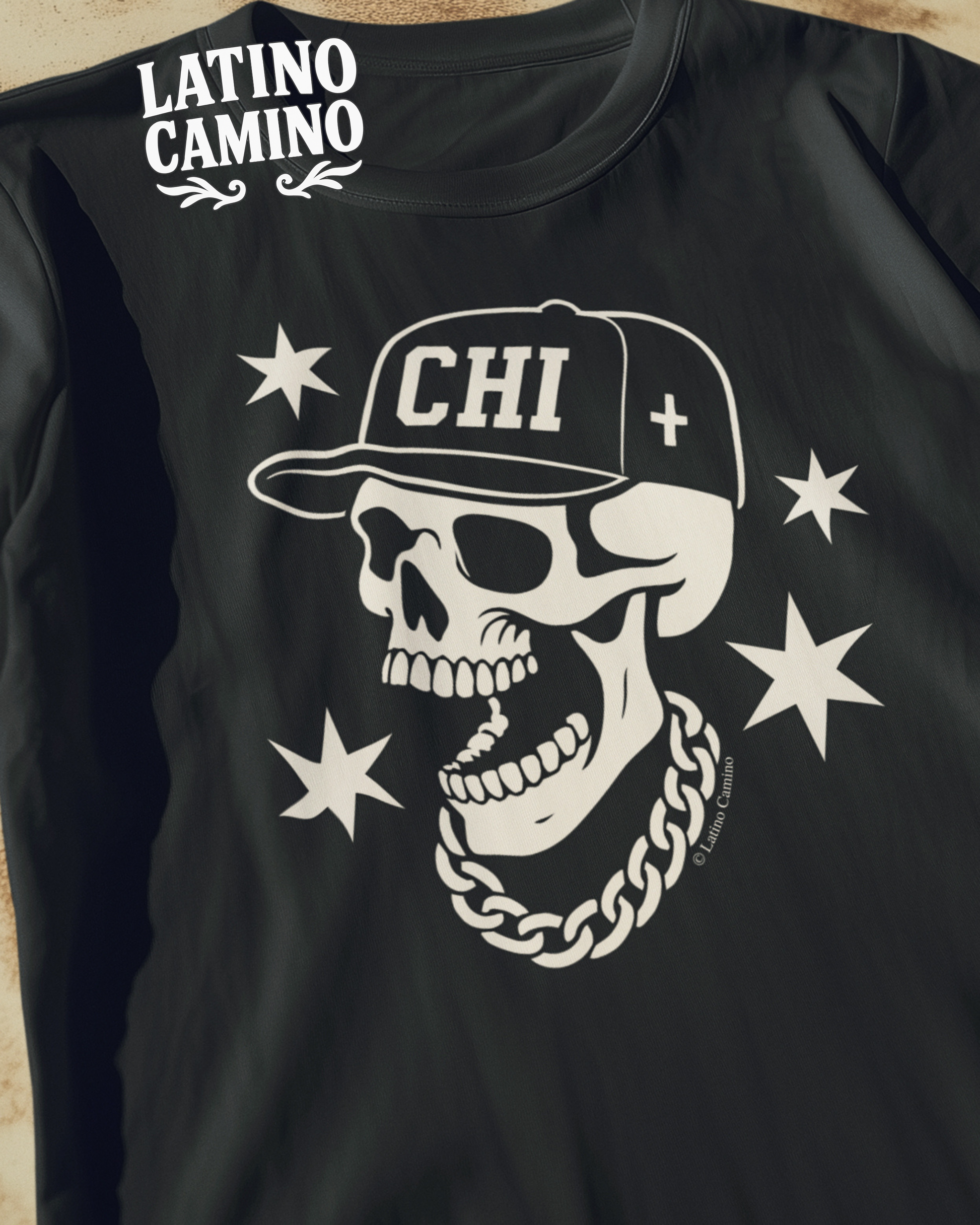 Unique to Latino Camino, this iconic Chicago skull design is perfect for getting in the face of whoever needs to see it!