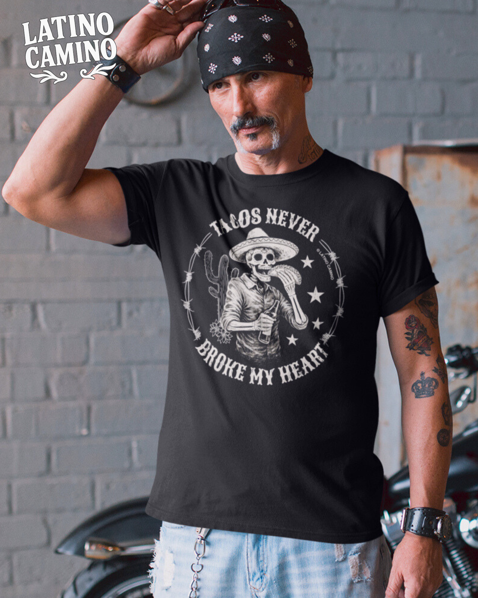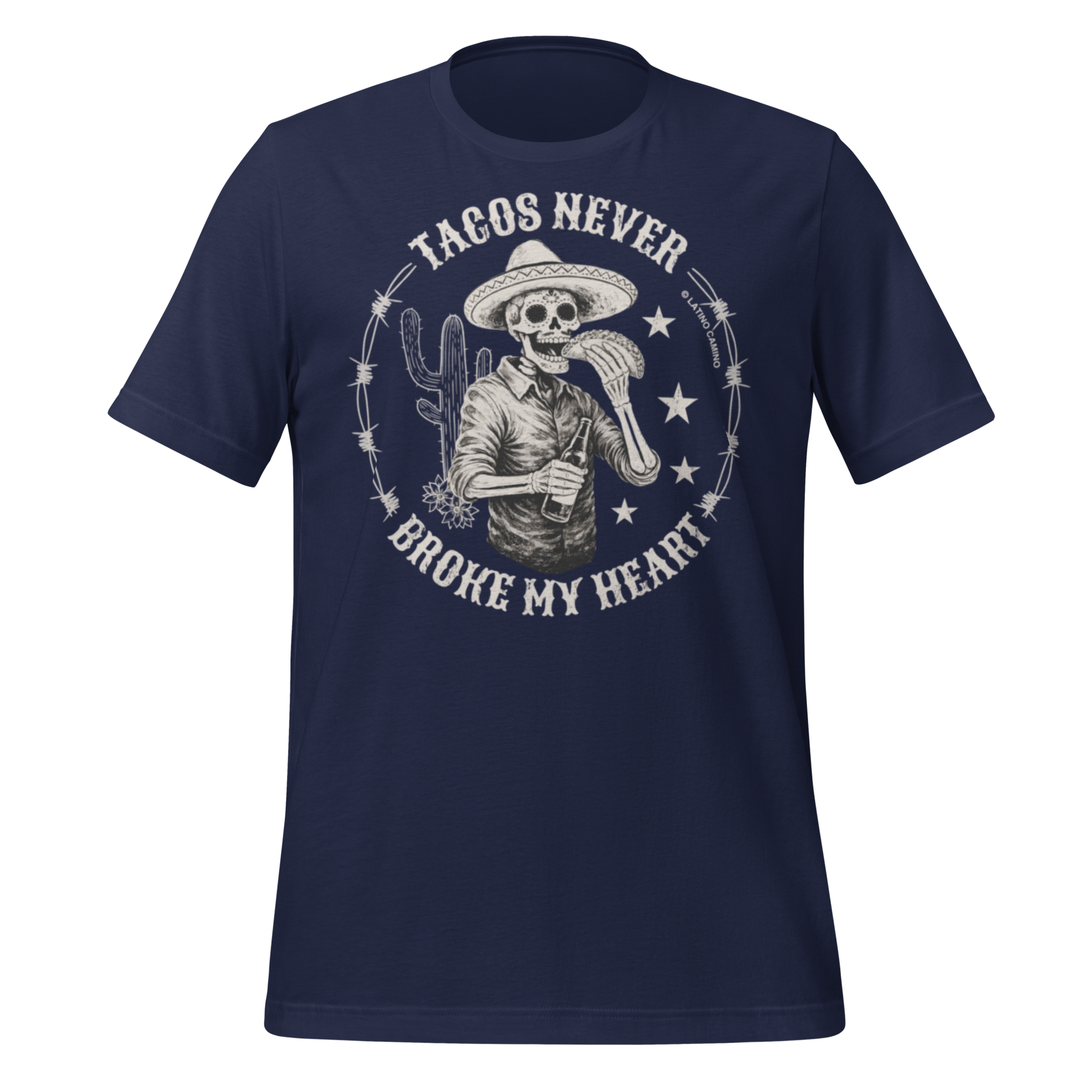 Remind them who never broke your corazon! Available in black or blue on tshirt FRONT. (Also available in black for printing on BACK.. Tacos rule the heart! (Don’t delay -- Order by Feb 2 for delivery by Valentine’s Day.)